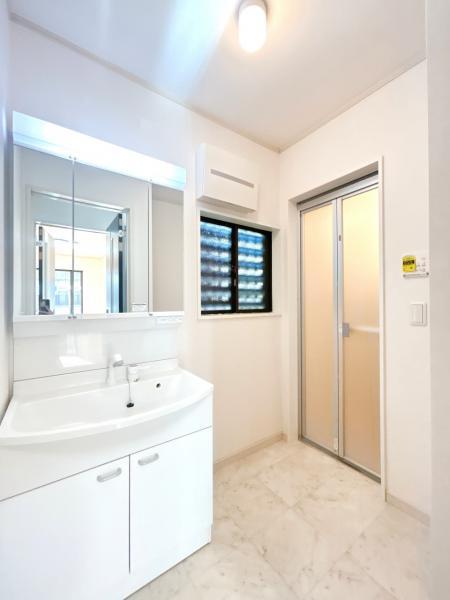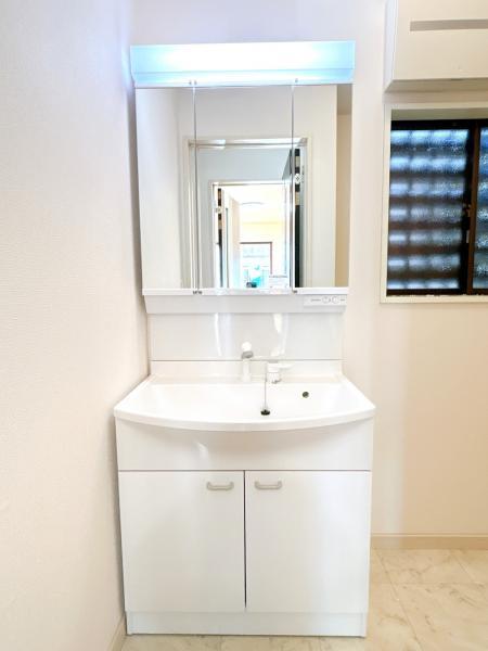 【リフォーム完成/年度内入居可能】洗面化粧台はパナソニック製の新品に交換しました。三面鏡の裏側はすべて収納になっています。洗面ボウルは底が平らなので、つけ置き洗いなどの家事でも活躍します。