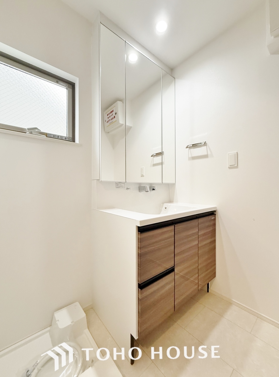 「機能性に優れた洗面台」上品で清潔感溢れるデザインの洗面化粧台です。三面鏡の裏側や洗面台脇部分、足元のキャビネットなど、収納豊富で実用的な洗面空間です。