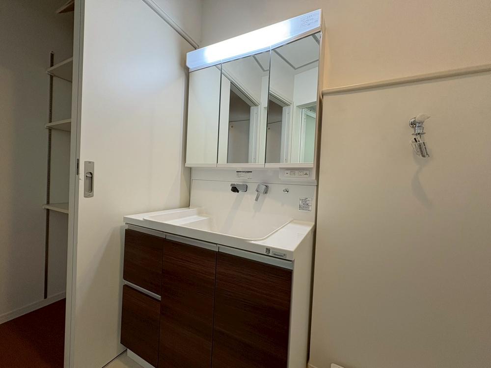 【朝の身だしなみ】洗面台には三面鏡を採用。身だしなみを整えやすい事はもちろんですが、鏡の後ろに収納スペースを設ける事により、散らかりやすい洗面スペースをすっきりさせる事が出来るのも嬉しいですね。