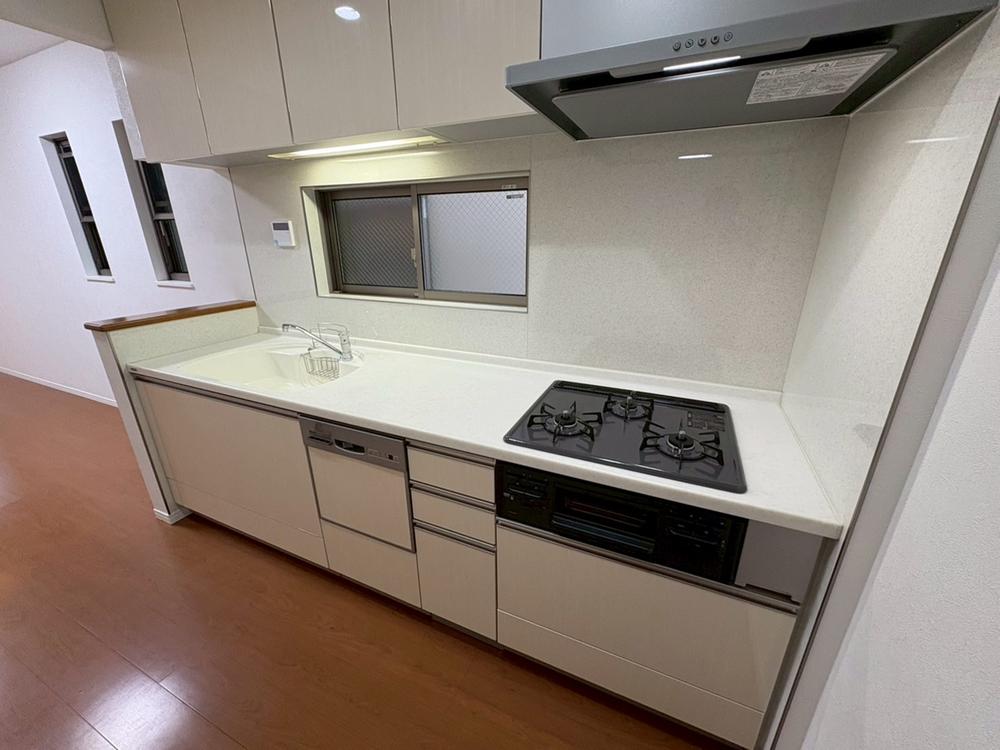 【広々キッチン】作業スペースの広いシステムキッチンです。ご家族やお友達と一緒に調理作業や片付けが出来ます。調理スペースが広いと散かりがちな調理器具も、収納が充実しているのでスッキリ片付きます!