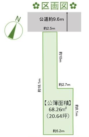 | 土地権利 | 所有権 | 私道負担・道路 | 無、北9.6m幅(接道幅2.5m) | ||