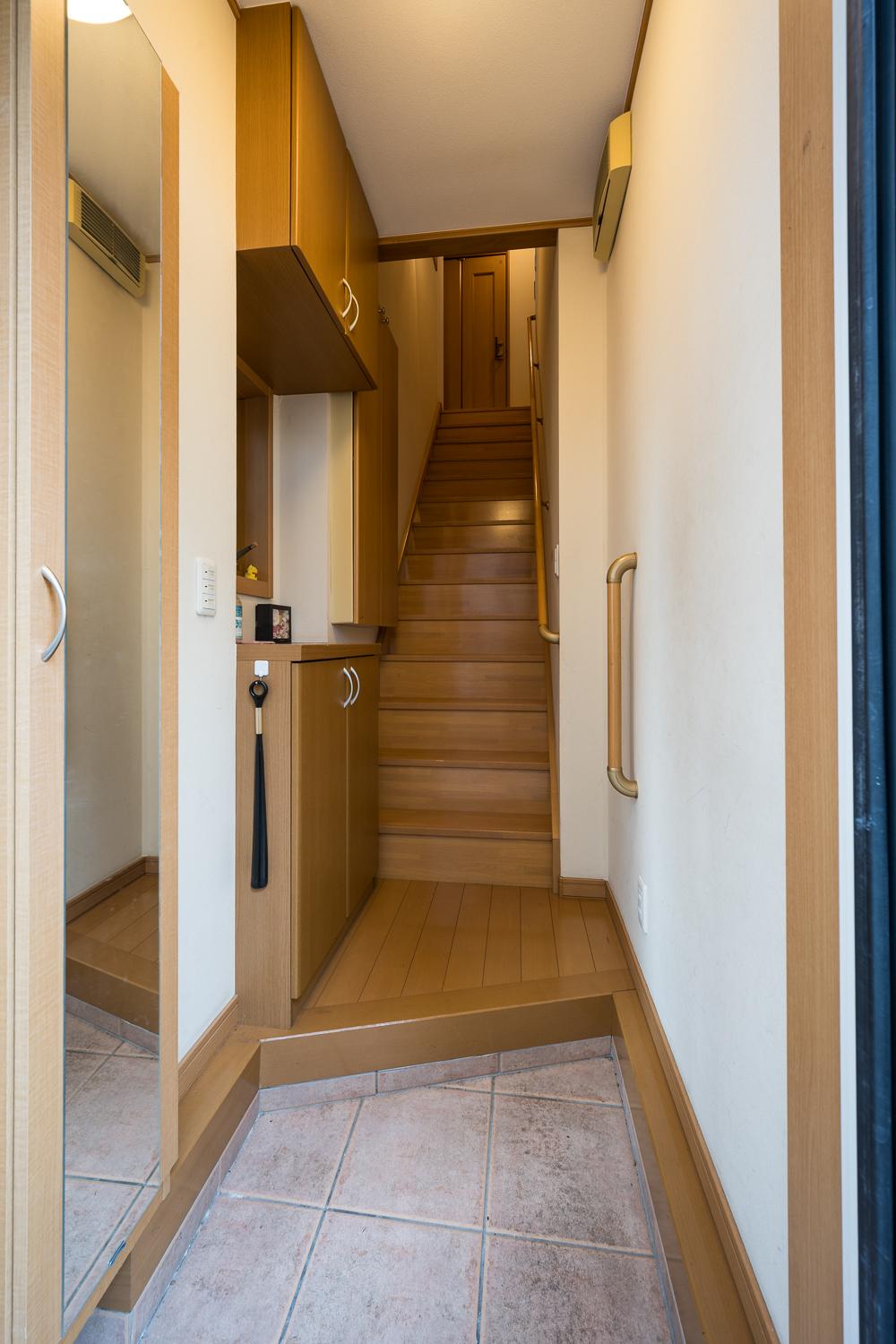 こちらの玄関は2階へ直接つながり、姿見と手すりを備えています。外出前の身だしなみ確認や、階段の昇降時の安全性にも配慮した設計です。