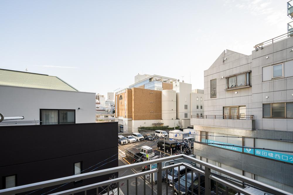 3階バルコニーから望む、都心ならではの開けた眺望。周囲の建物と程よい距離が保たれ、空の広がりや街の表情を感じられます。千代田区富士見に位置し、利便性と落ち着きを兼ね備えた住環境が魅力です。