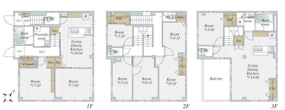 6億8800万円、8LLDDKK、土地面積108.61㎡、建物面積173.54㎡ 1階世帯と2・3階世帯を分離した8LLDDKKの間取り。2階の5部屋は、3部屋が1階、2部屋が3階LDKと接続し、共用部を介さず独立した生活が可能です。