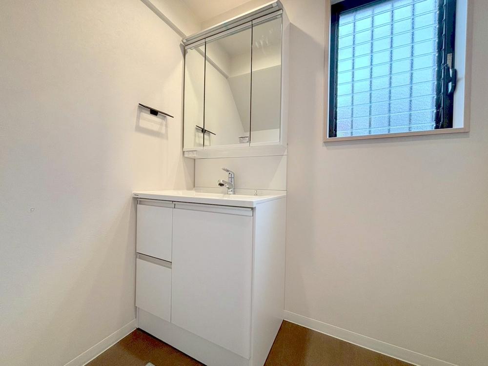 リフォーム完了しました♪身支度がしやすい3面鏡タイプの洗面化粧台を採用。鏡の裏にはたっぷりの収納スペースがあり、スッキリとした洗面空間を保てます。お気軽にアムティックまで♪(令和7年10月26日撮影)