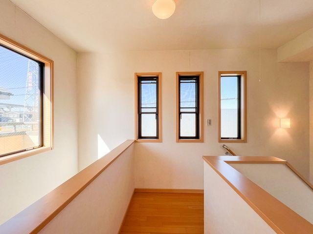 2階廊下に面した吹き抜けが、住まい全体にゆとりある空気感をもたらします。1階玄関からの視線の抜けが心地よく、実際の面積以上の広がりを感じさせてくれるデザイン性の高い空間です。