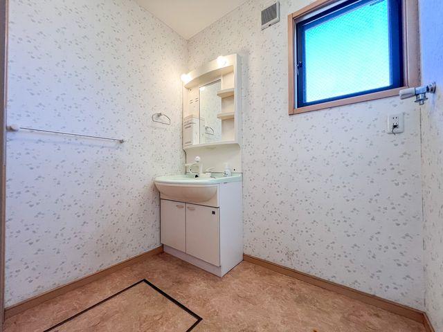 洗面脱衣室は洗濯機を置いても十分なゆとりがある設計です。キッチンや浴室、トイレと1階に水回りが集約されているため、お料理の合間に洗濯をこなすなど、家事動線が非常に効率的で忙しい朝もスマートに動けます。