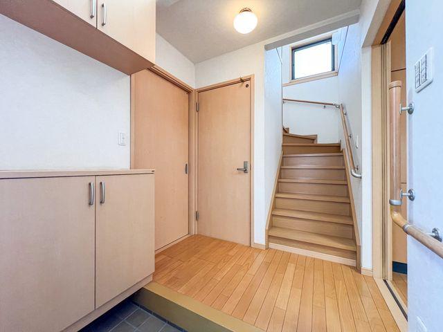 玄関を開けると、吹き抜けから差し込む柔らかな光が家族を迎え入れます。上部まで抜けた空間が、実際の間取り以上のゆとりと開放感を演出。
