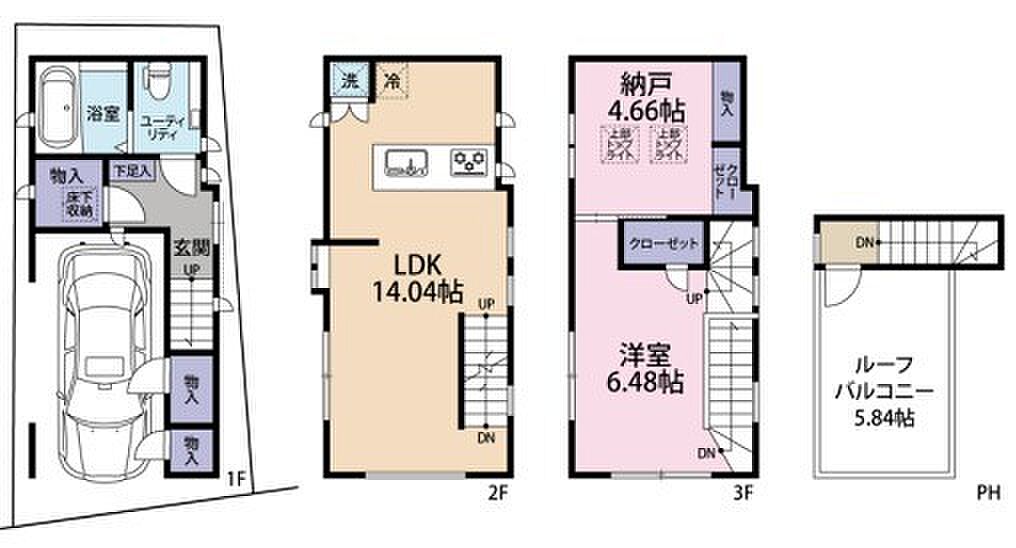 建物構造 | 木造/3階建 | 間取り詳細(帖) | リビングダイニングキッチン 14帖洋室 6.4帖収納 4.6帖 | ||
