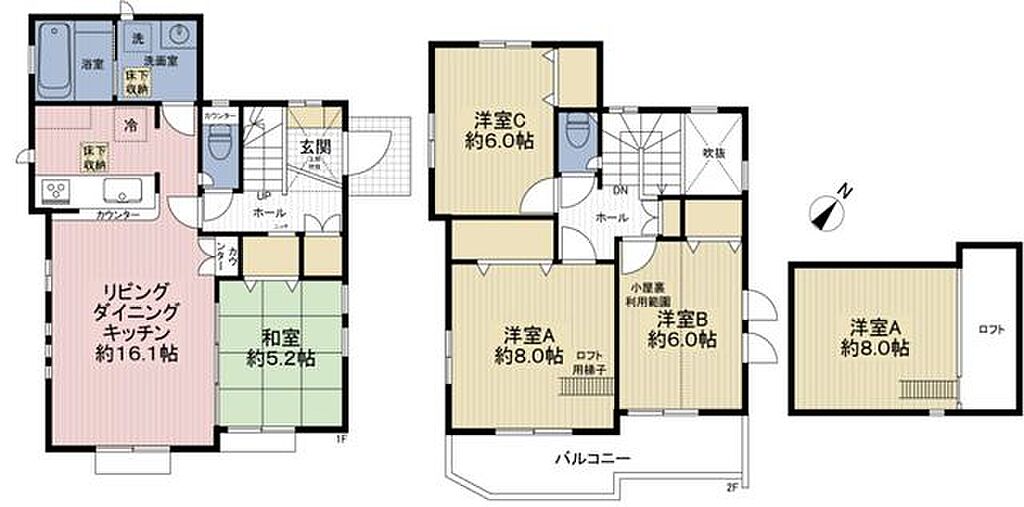 | 設備・サービス | バルコニー、フローリング、下水、都市ガス、ロフト付き、室内洗濯機置場、温水洗浄便座、専用トイレ、専用バス、追焚機能、シャワー付洗面化粧台、洗面所独立 | ||||