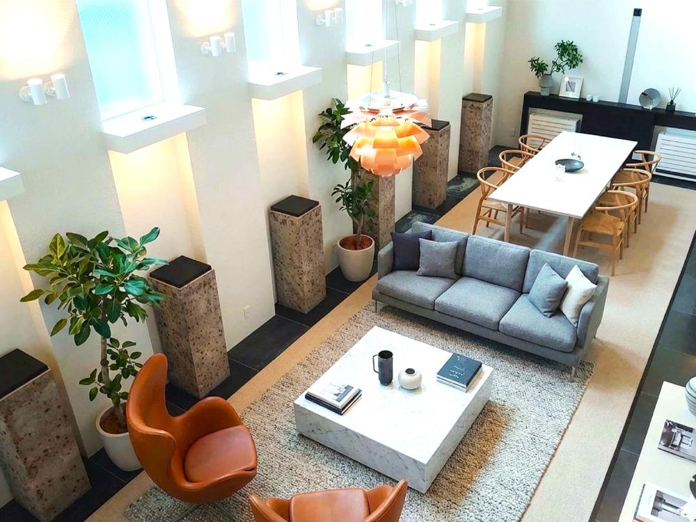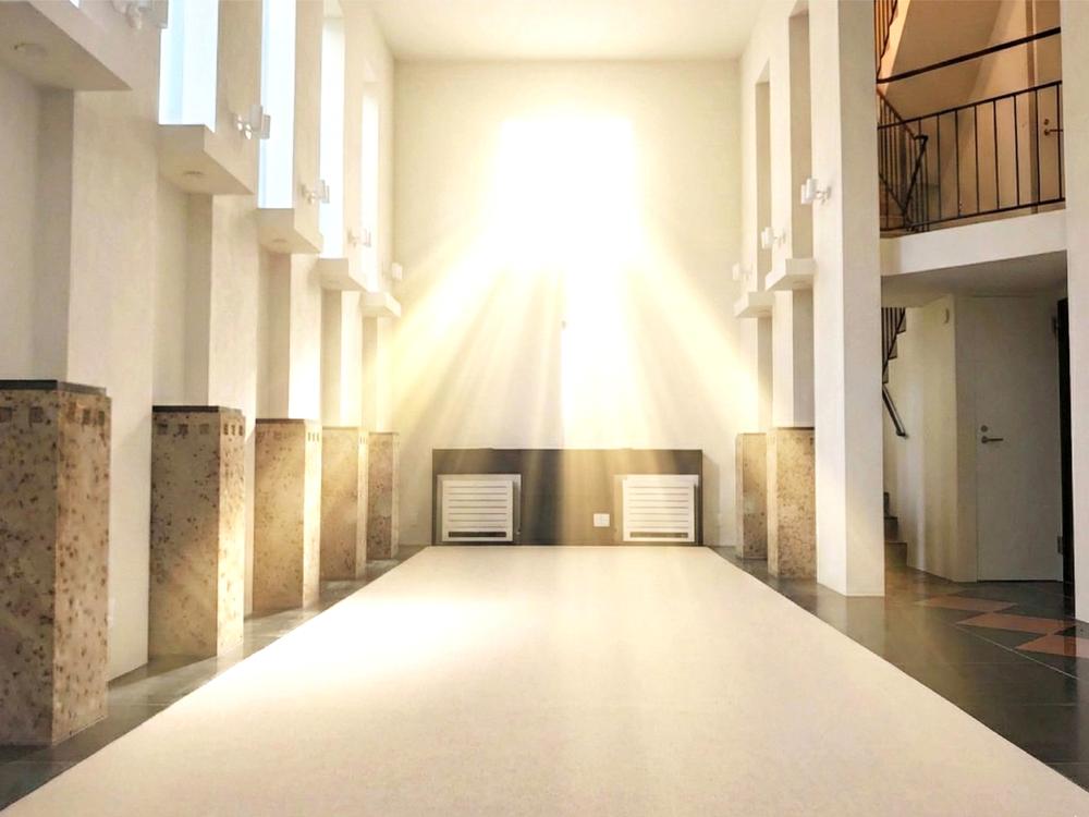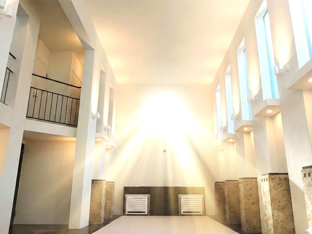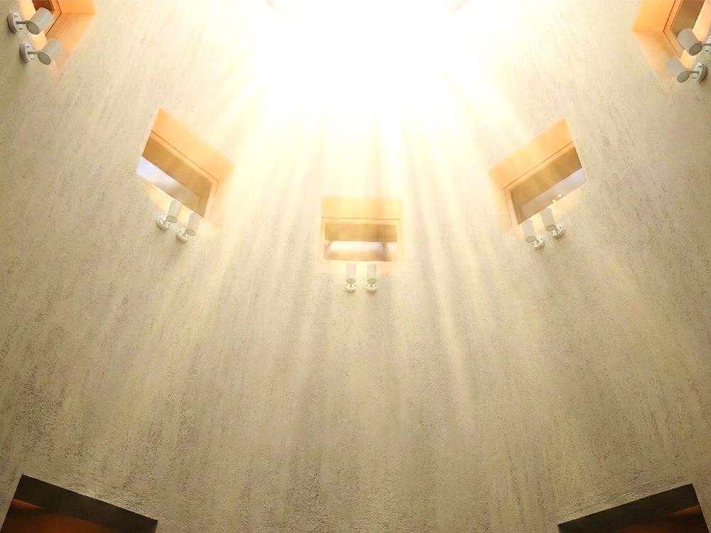 見上げれば光を受け止める30帖の壮大な器。教会のような神々しい陽光が、3層を貫く垂直の美を際立たせます。息をのむ圧倒的スケールと陰影のドラマ。ここは建築という芸術が、最も雄弁に語りかける場所