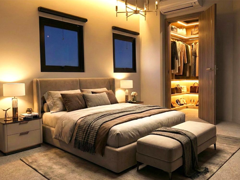 広々と設けられた主寝室は、まさにこの邸宅のスイートルーム十分な広さがあることで、ただ「眠るための部屋」ではなく、自分自身をリセットし、整えるための“私的なラウンジ”のような場所に※家具類はCG
