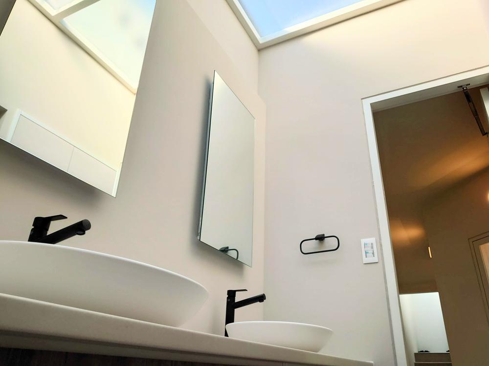 ゆとりあるダブルボウルの洗面スペースは、忙しい朝でも並んで使える嬉しい設計水まわりとは思えないほどスタイリッシュな佇まい、たっぷりと確保された収納力、そしてトップライトからの豊かな採光!