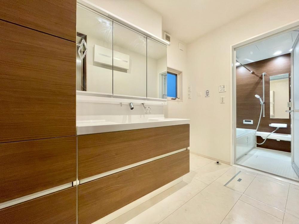 落ち着いた色合いで統一された室内はホテルライクな空間を創造しております。身だしなみのチェックがしやすい大きな鏡、下には収納がたっぷり。可動棚もあるのでスッキリとした空間をお作りいただけます。
