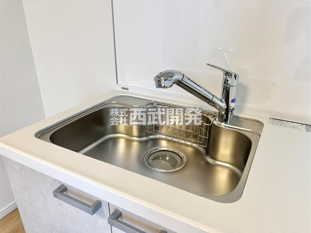 キッチン水栓は浄水機能がご利用いただけるほか、蛇口が伸縮タイプでシンク周りのお掃除もらくらくです。