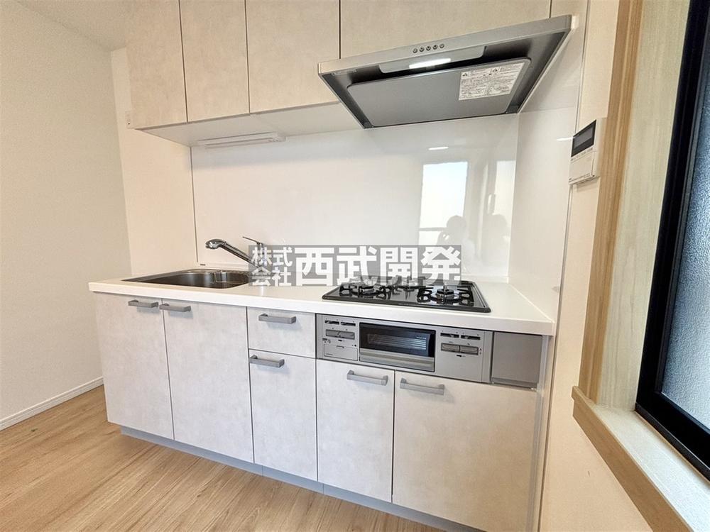 システムキッチン新規交換済み。キレイなキッチンで新生活をお楽しみください。ホワイト系の面材カラーが落ち着いた印象と清潔感を与えます。