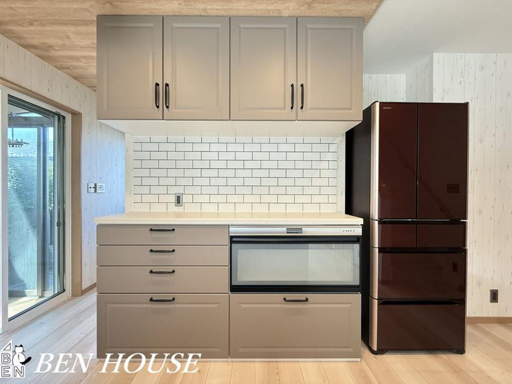 ・IHクッキングヒーター搭載のシステムキッチン・カップボードのあるキッチンスペースでは電子レンジやトースターもスッキリ片付きます・パントリーには食品だけでなく季節家電などもしまえますね