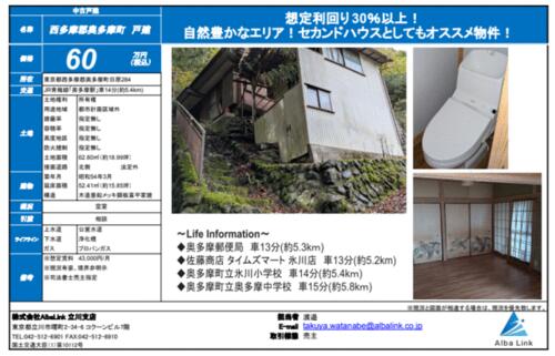 | 備考 | ※想定賃料 43,000円/月※現況有姿、境界非明示※司法書士売主指定・お世話になっております!株式会社AlbaLinkの渡邉です。今回ご紹介するのは、 東京都西多摩郡奥多摩町の物件になります!!◎自然豊かなエリア♪ ◎セカンドハウスとしてもオススメ物件! | ||||