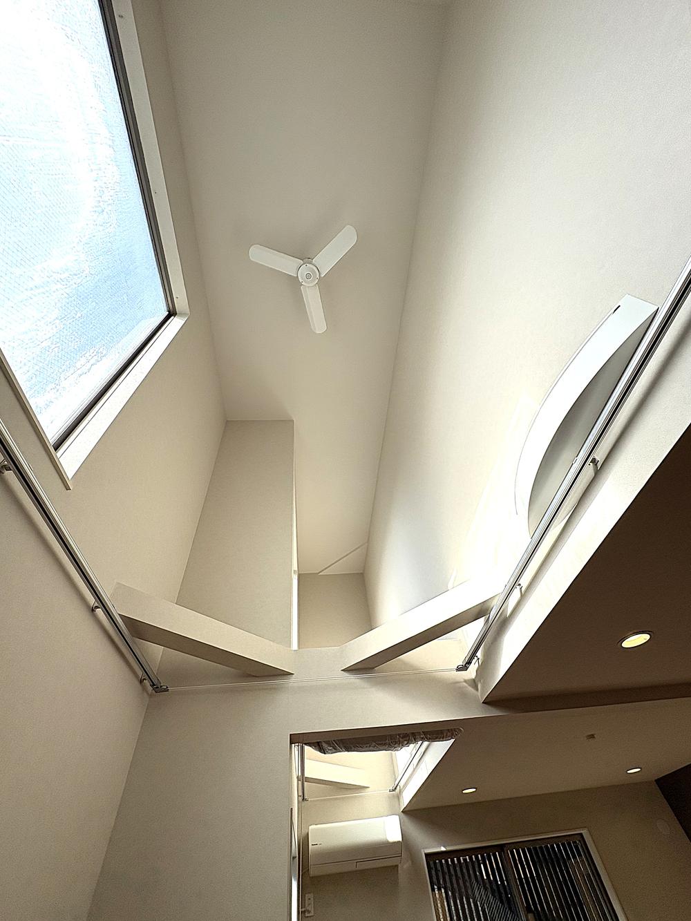 ~リビングの吹き抜け~ 2階リビング上部に設けた吹き抜けが、圧倒的な開放感と明るさを演出します 。角地ならではの通風も心地よく、家族が開放的に寛げる空間です。夏季用のサンシェードも付いております。