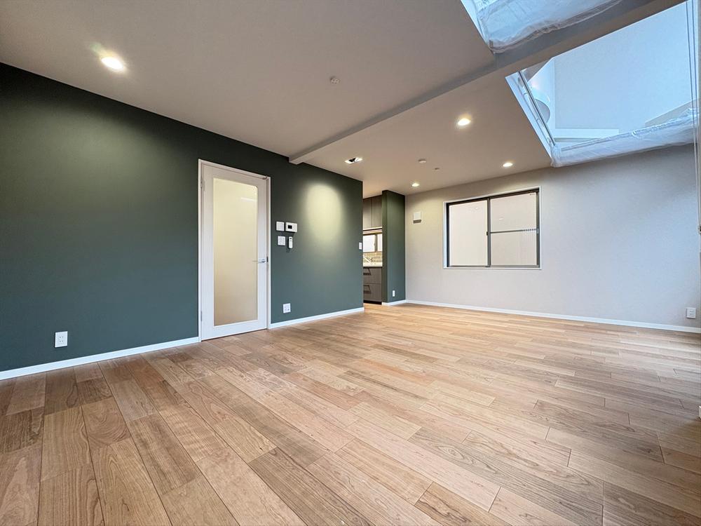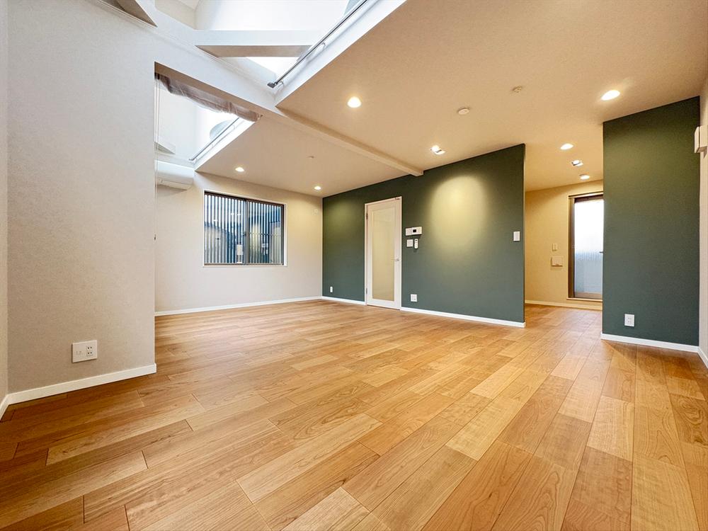 ~デザインが響き合うLDK~キッチンと同じ深みのある緑色のアクセントクロスを採用。LDKに統一感と落ち着きをもたらします。吹き抜けから注ぐ陽光がモダンな内装を美しく引き立てる日当たり良好な住まいです。