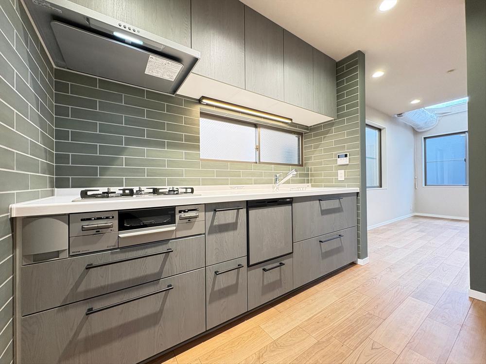 ~床暖房完備のLDK~リビングダイニングには床暖房を設置。冬場も足元からポカポカと暖かく、家族の団らんを優しく包み込みます。キッチンと統一した緑のアクセントクロスが映える、上質なデザイン空間です。