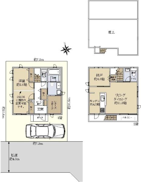 | 土地権利 | 所有権 | 私道負担・道路 | 8.79㎡、南4m幅(接道幅7.9m) | ||