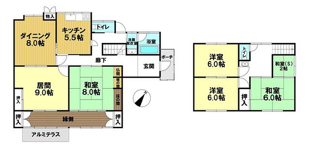 | 建物構造 | 木造/2階建 | 間取り詳細(帖) | 和室 8畳(1階)リビング 9帖(1階)ダイニング 8帖(1階)キッチン 5.5帖(1階)和室 6畳(2階)洋室 6帖(2階)洋室 6帖(2階)収納 2帖(2階) | ||