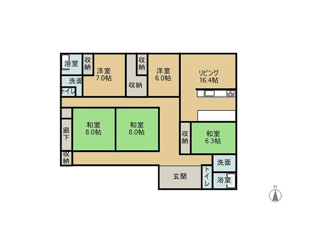 | 建物構造 | 木造/1階建 | 間取り詳細(帖) | 和室 6.3畳(1階)和室 8畳(1階)×2洋室 6帖(1階)洋室 7帖(1階) | ||