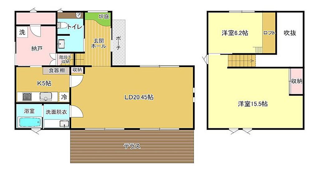 | 建物構造 | 木造/2階建 | 間取り詳細(帖) | リビングダイニング 20.4帖(1階)キッチン 5帖(1階)洋室 6.2帖(2階)洋室 15.5帖(2階) | ||