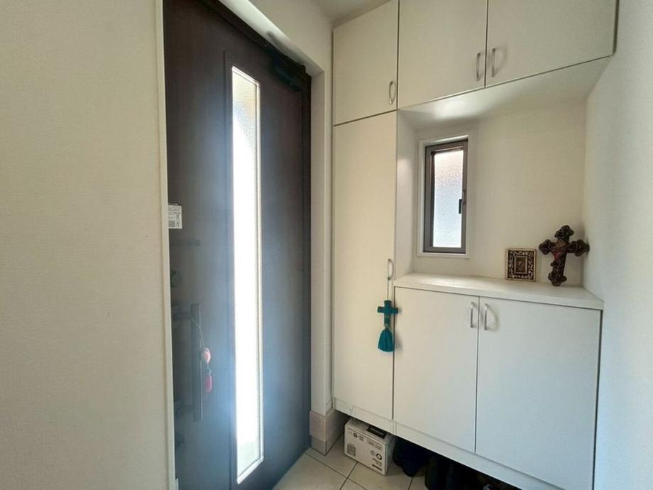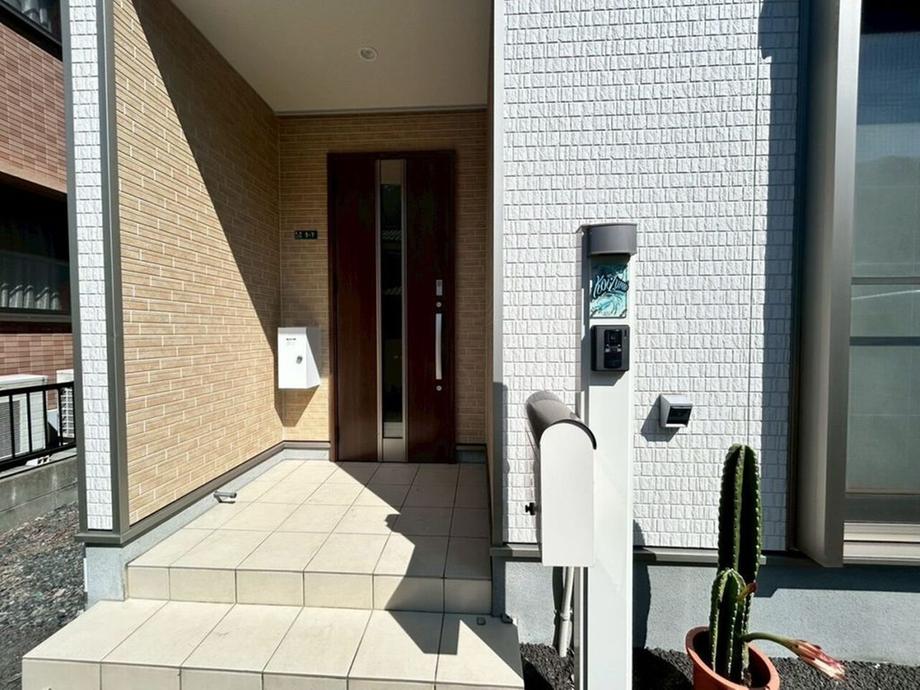 採光窓付きの玄関ドア!明るい光が差し込み、気持ちよくお出かけできますね!落ち着いた色合いの玄関ドアがアクセント!訪れる人を温かく迎え入れます。