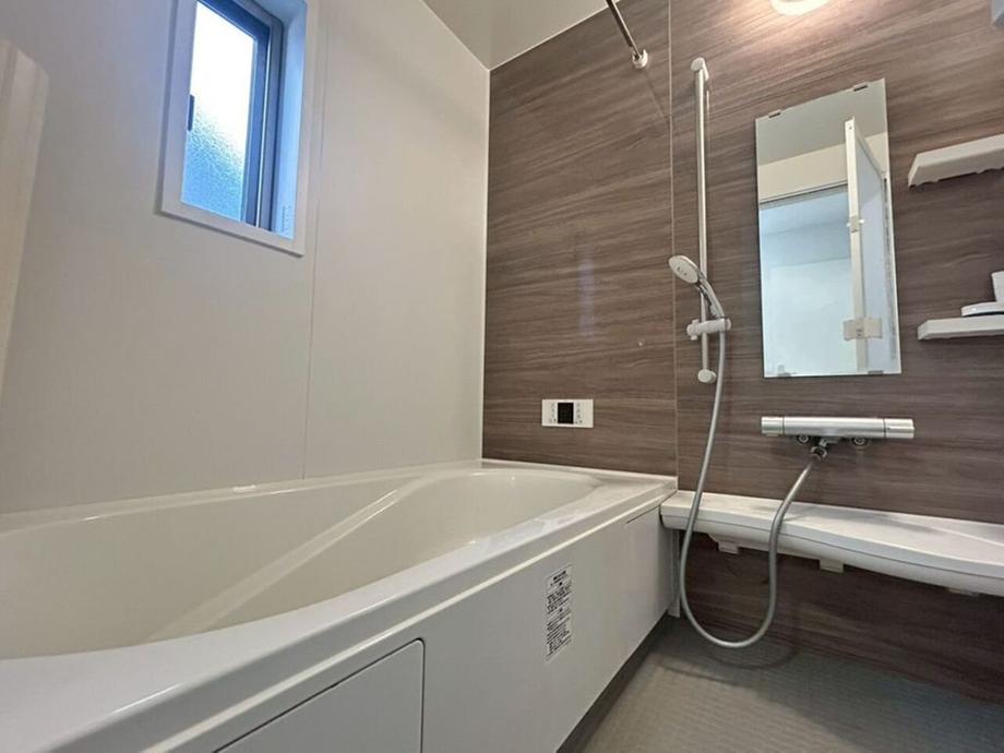 ブラウンのアクセントパネルがおしゃれ!落ち着いた雰囲気の浴室で癒やされます!