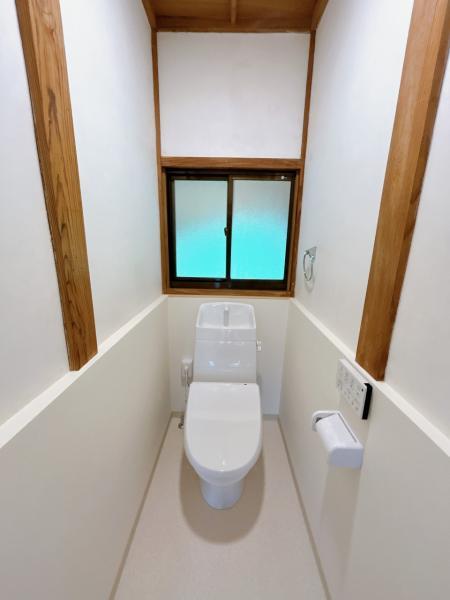 【リフォーム済】トイレはLIXIL製の温水洗浄機能付きに新品交換いたしました。表面は凹凸がないため汚れが付きにくく、継ぎ目のない形状でお手入れが簡単です。節水機能付きなのでお財布にも優しいですね。