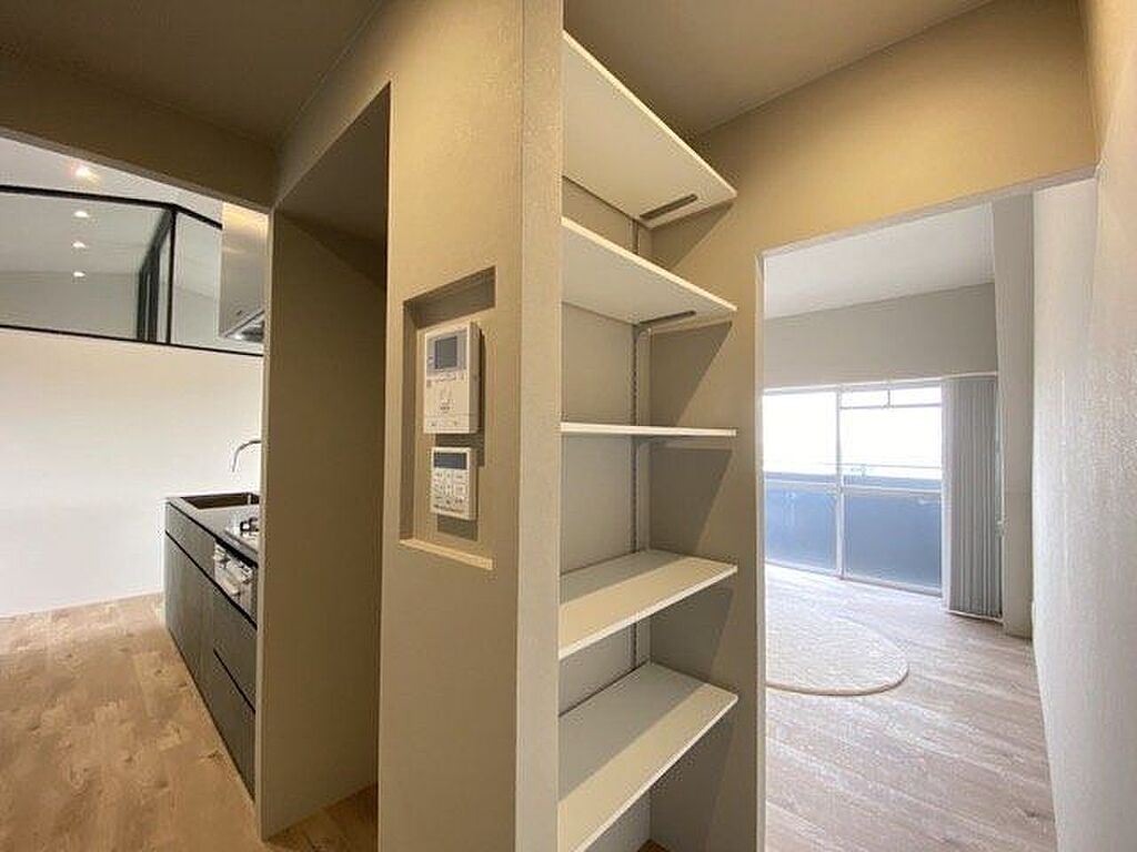 パントリースペースには冷蔵庫置き場やインターフォンもあります。キッチングッズはもちろん、食料品のストックなど収納出来そうですね。