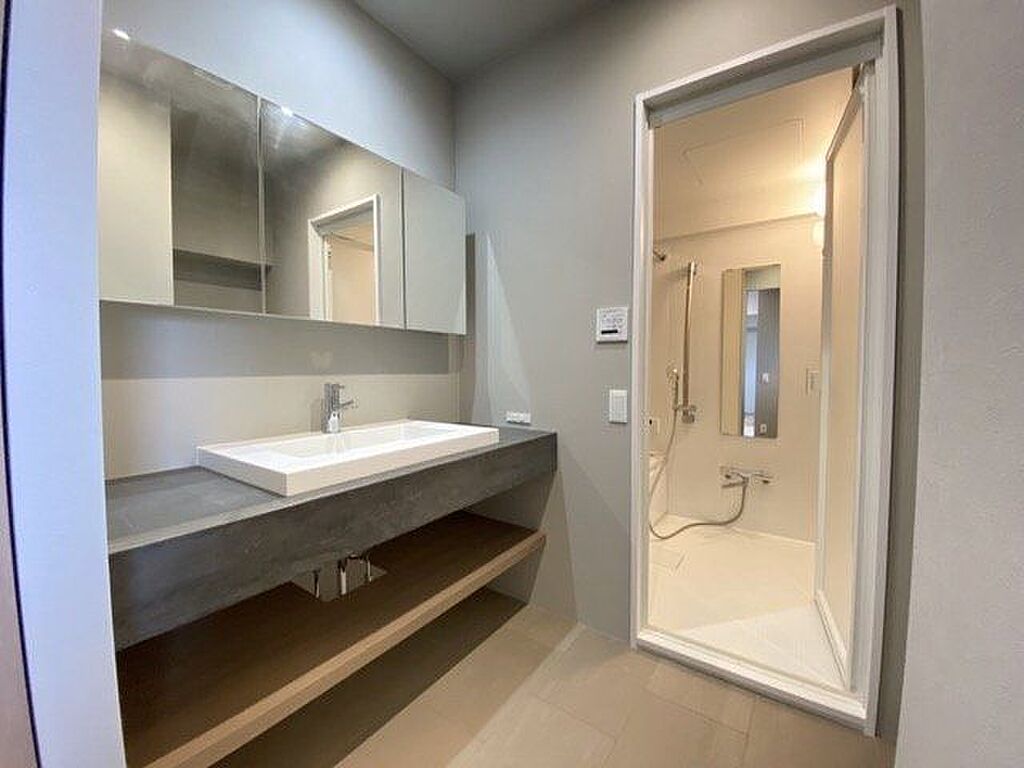3面鏡仕様の洗面台。鏡の裏が収納になっていて小物がスッキリ片付きます。お子様と並んで朝の身支度ができます♪