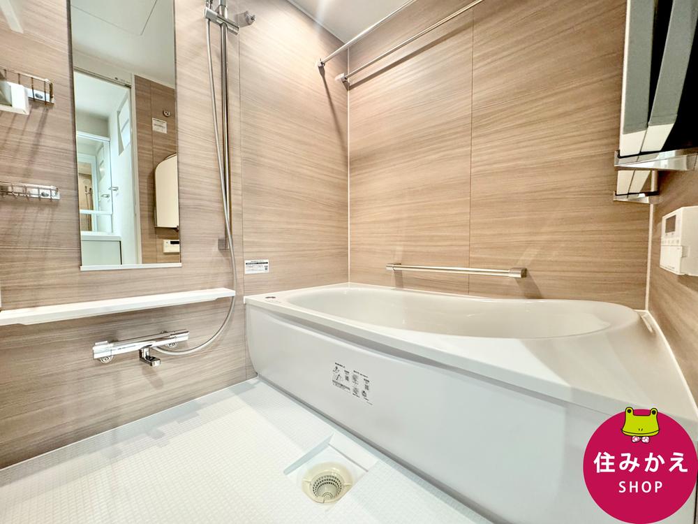 浴室にはベージュ系のアクセントウォールを使用し、この色は平和と静寂を連想させるため気分を良くする効果があり、日頃のお仕事や家事で溜まった疲れを癒すことができます。室内(2025年9月)撮影