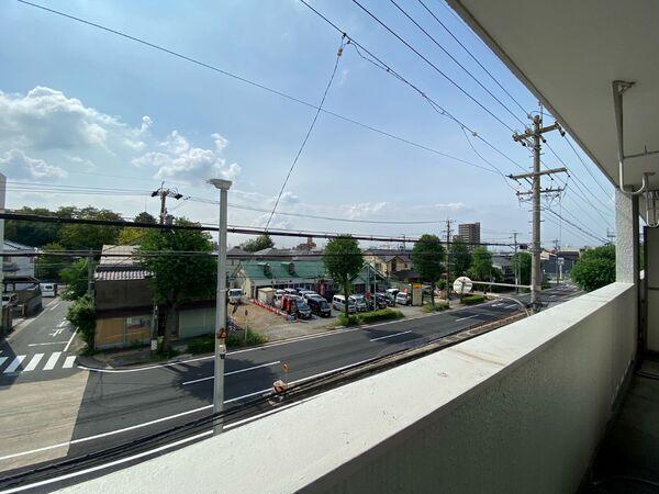 南向きバルコニーからの眺望。道路に面しているため、間近に壁や隣住戸の窓がなく圧迫感が少ないです。【住戸からの眺望写真】(2024年09月撮影)