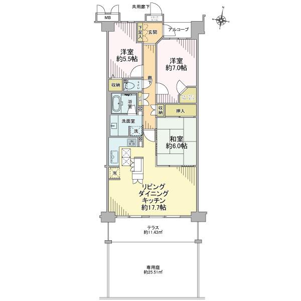 | その他面積 | バルコニー面積:11.43㎡、専用庭:25.51㎡(使用料770円/月)、テラス:11.43㎡(使用料無) | 土地権利 | 所有権 | ||