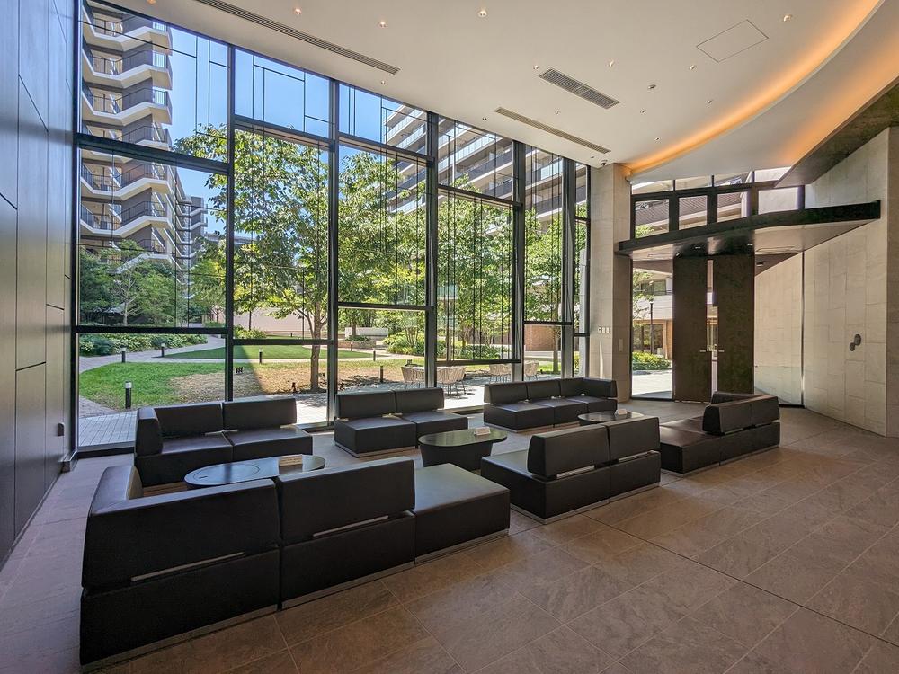 【ロビー】ホテルのラウンジを彷彿とさせるロビー。窓の外には、緑豊かな中庭が広がります。テーブルとソファが設置されており、待ち合わせスペースとしても活用可能です。