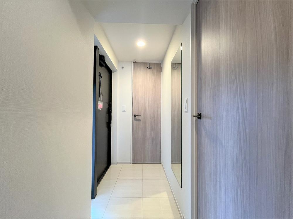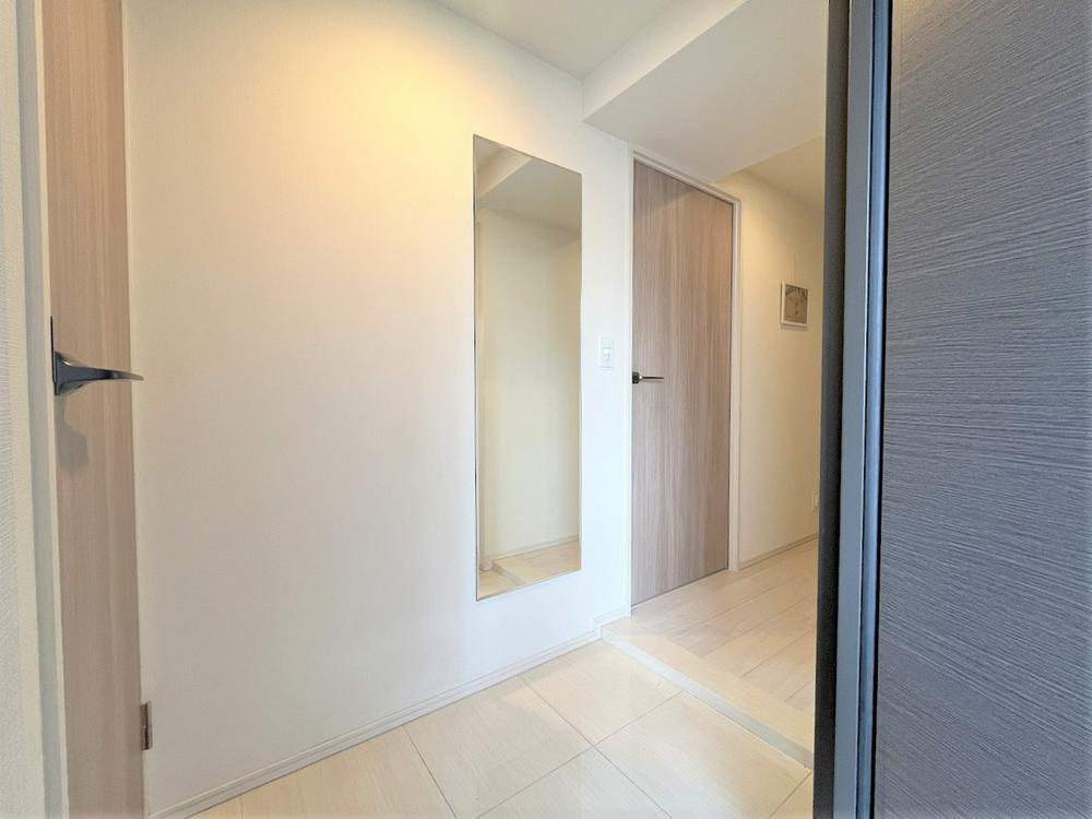 【玄関】玄関ホールには姿見があり、お出かけ前の身支度チェックに便利です。広さにゆとりがあり、家族揃ってお出かけする際にもスムーズに出入りできそうです。
