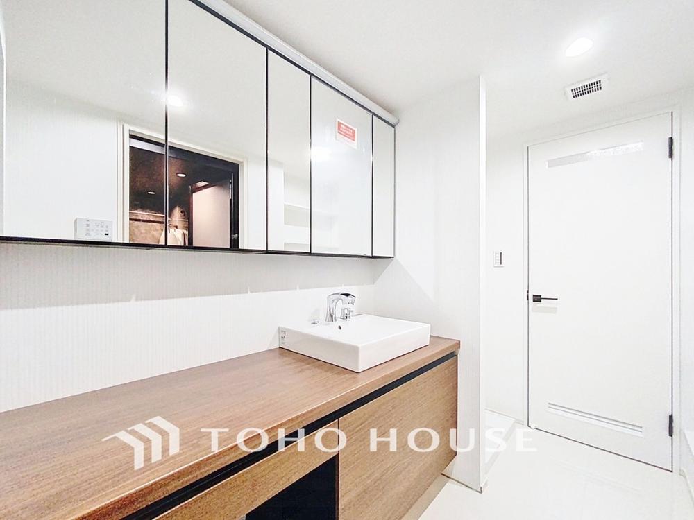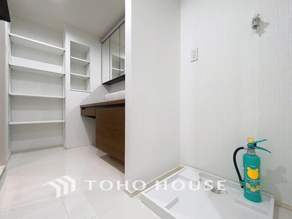「壁面収納×洗面所」洗面所には、トールサイズの壁面収納が設置されています。バスタイムに必要な備品はもちろん、ランドリー用品など様々な収納スペースとして活用して頂けます。