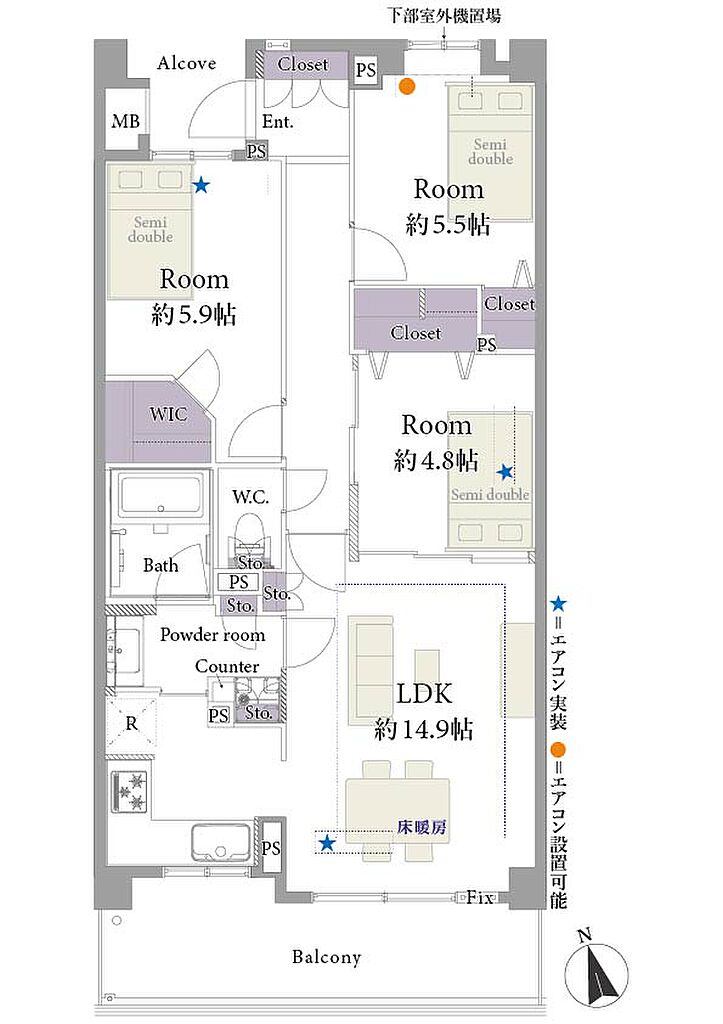 | 設備・サービス | 床暖房、バルコニー、エアコン、フローリング、出窓、タイル貼り、ウォークインクローゼット、室内洗濯機置場、浴室乾燥機、温水洗浄便座、バス・トイレ別、シャワー、洗面所独立、エレベーター | ||||