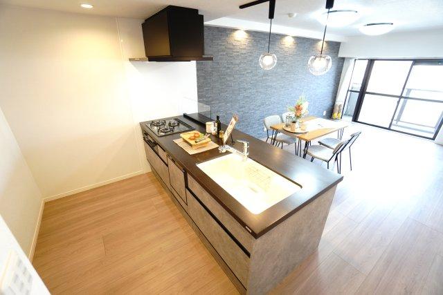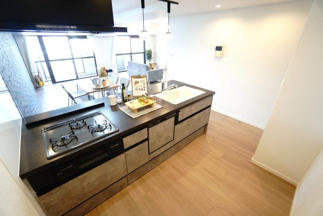 【キッチンスペース】 キッチンがフラット対面式となっており、 壁の代わりに強化ガラスオイルガードを使用し開放感を演出 アイランドキッチンみたいな雰囲気で、 まるで、ステージからリビングを見渡すようです