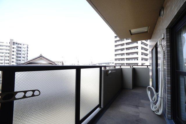 【バルコニー】 リビング全面が接するワイドバルコニー。 前面の建物が邪魔することなくよく陽が当たり、お洗濯物もすぐ乾きそう! この位の広さがあると、エアコン室外機を置いても十分なスペースを保てます。