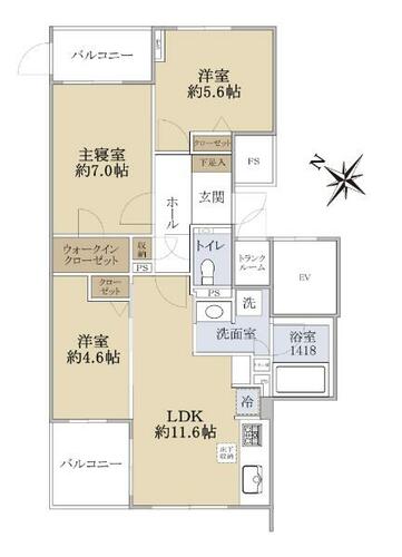 | 備考 | ・住戸玄関横にトランクルーム1.21㎡あり(専有面積に含む)・専用駐車区画1台分あり(車種による、使用料7000円/月)/・駐輪場:有(1台あたり屋内200円/月、屋外100円/月)・バルコニー面積:2ヵ所のバルコニー合計面積であり 各面積不詳・バス所要時間調査日:2026年2月21日・施工会社:新太平洋建設株式会社・維持費等:インターネット使用料1,800円/月・管理形態/管理員の勤務形態:全部委託/日勤・◎2023年2月築 ◎南西・北西・北東の角住戸 | ||||