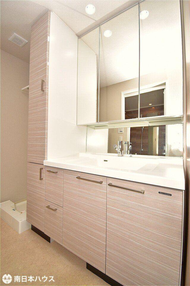 【洗面台】3面鏡の洗面台です!キャビネット付きで収納が多く水回りもスッキリと片付きます♪