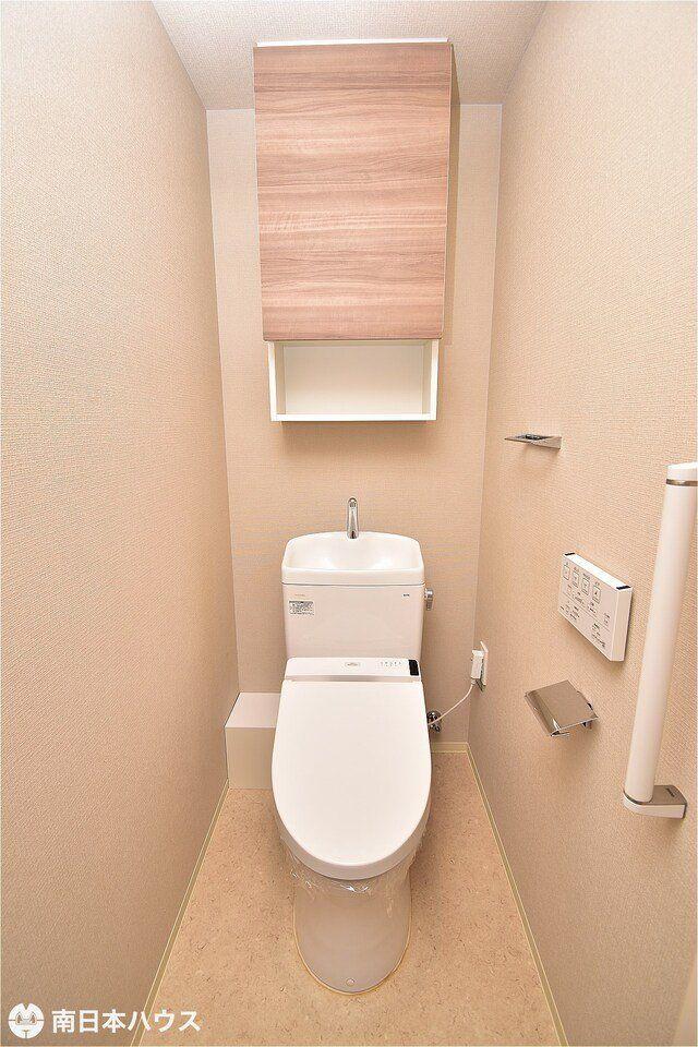 【トイレ】温水洗浄便座機能付きのトイレです!上部には収納棚がありトイレットペーパーなど収納可能です♪