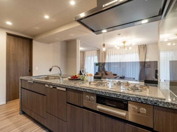 棟内76㎡以上の住戸限定のアップグレードプランが適用され、美しい透明感で高級感を演出するガラストップコンロ、手をかざすだけで吐水・止水が操作できるタッチレス水栓など暮らしを豊かにする設備が充実です