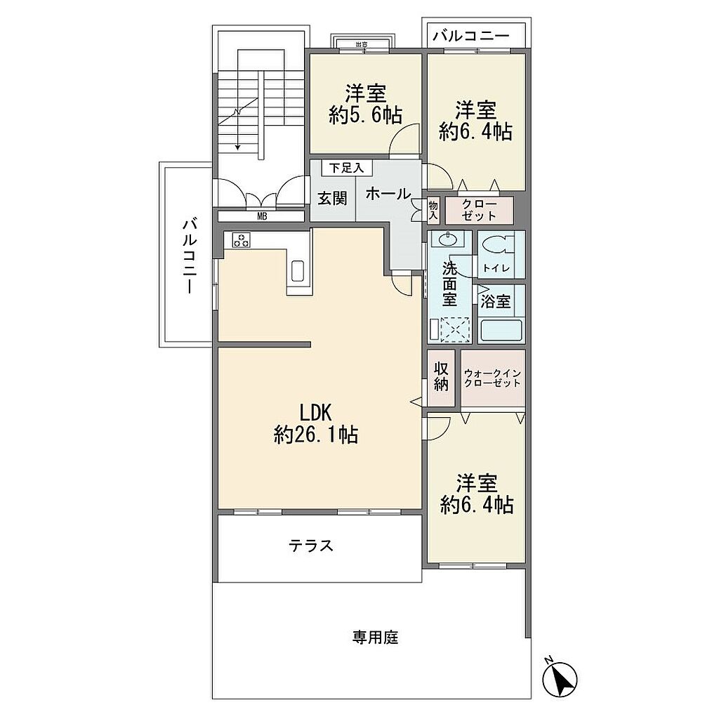 | 建物構造 | RC(鉄筋コンクリート) | 間取り詳細(帖) | リビングダイニングキッチン 26.1帖洋室 6.4帖洋室 6.4帖洋室 5.6帖 | ||