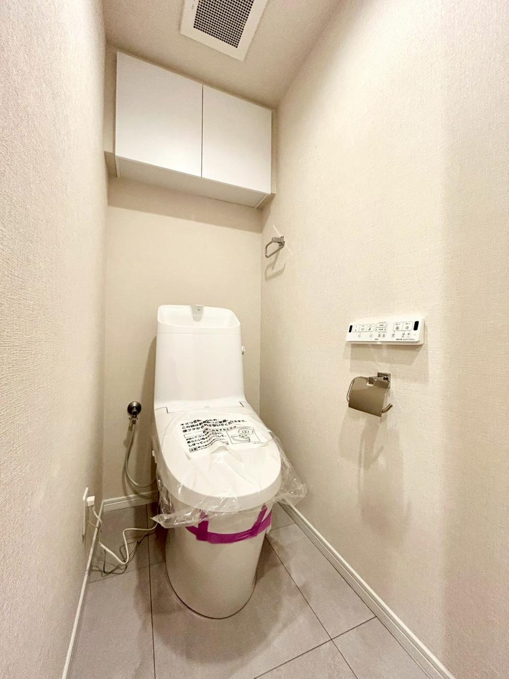 広くて深い手洗鉢付き、シンプルな機能のみを搭載したモデルです、収納も完備されており、トイレ関連のものはトイレ内に仕舞う、適材適所の収納がポイント。トイレットペーパーやその他の小物も隠すことができます♪