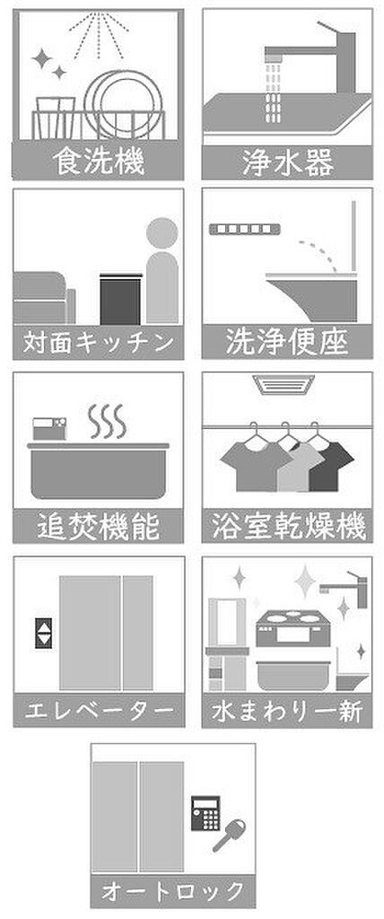 | 設備・サービス | バルコニー、フローリング、下水、都市ガス、公営水道、室内洗濯機置場、浴室乾燥機、温水洗浄便座、追焚機能、バス・トイレ別、シャワー、洗面所独立、エレベーター | ||||